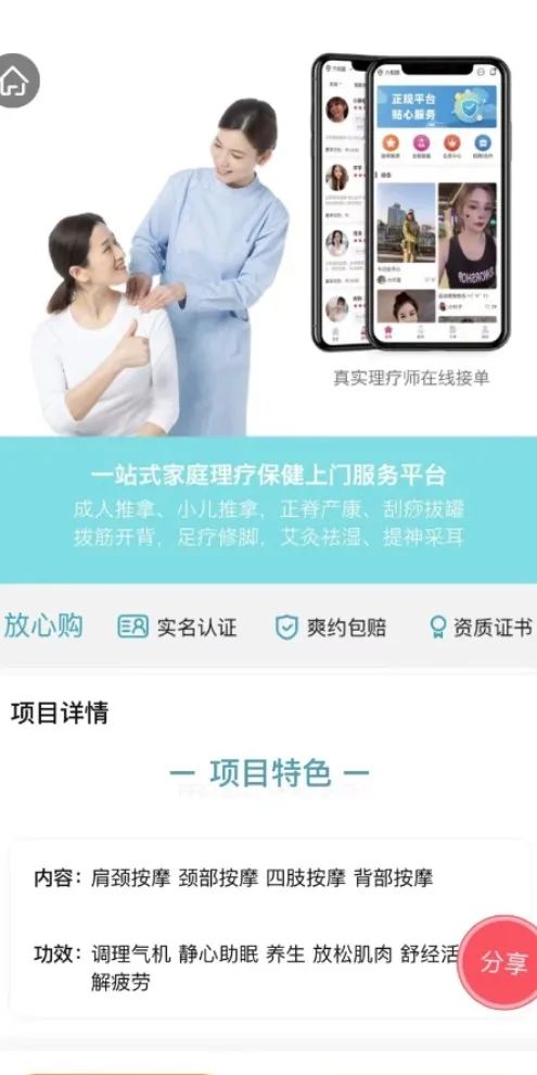 01 华佗到家、健康到家 一站式家庭理疗上门服务平台 华佗到家是青岛无极阳生中医推拿培训基地打造的中医理疗上门服务平台,是讯飞云港中医大健康赛道重点孵化的生态链企业。为用户提供基本的推拿按摩理疗上门服务,重点针对颈肩背腰、肠胃不适、头痛失眠、泡脚足浴、精油开背以及小儿感冒咳嗽、便秘腹泻、积食呕吐等保健调理项目。