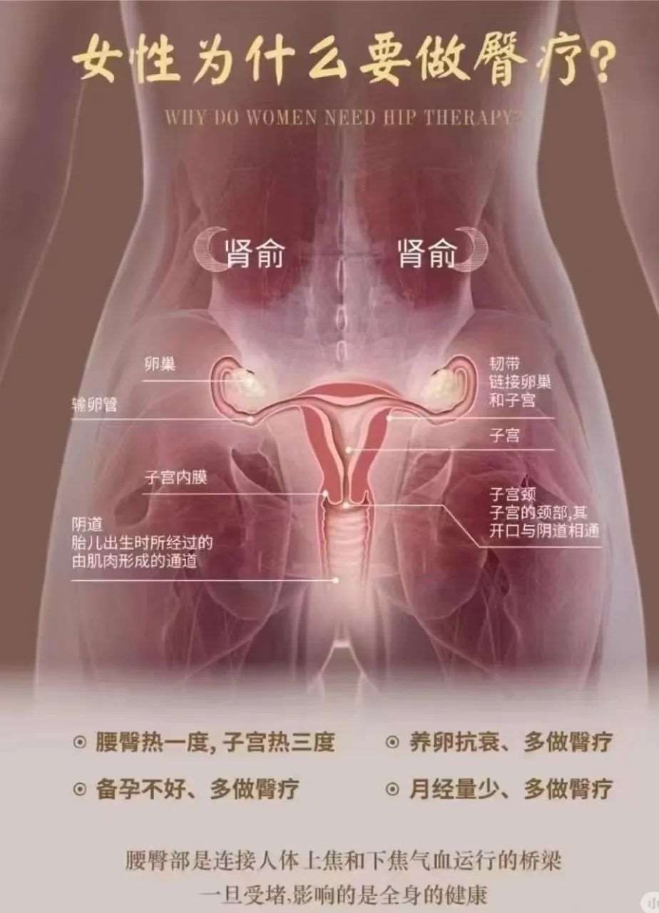 现代人工作以坐姿为多、久坐少动,这容易造成腰臀部血液循环不畅、瘀血停滞。因此女性臀部的督脉、太阳经、少阳经,若是经气不足、阳虚阴盛,就可能出现痛经、经血紫暗、夹杂血块、经血下泄不畅,或腰臀及下肢坐骨神经疼痛、腿脚麻木无力等气滞血瘀病症。